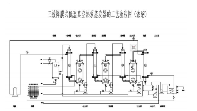 三效蒸發(fā)器是由相互串聯(lián)的三個(gè)蒸發(fā)器組成,低溫(90℃左右)加熱蒸氣被引入效,加熱其中的廢液,產(chǎn)生的蒸氣被引入第二效作為加熱蒸氣,使第二效的廢液以比效更低的溫度蒸發(fā),這個(gè)過(guò)程一直重復(fù)到一效。效凝水返回?zé)嵩刺帲渌餍畢R集后作為淡化水輸出,一份的蒸氣投入,可以蒸發(fā)出多倍的水出來(lái)。