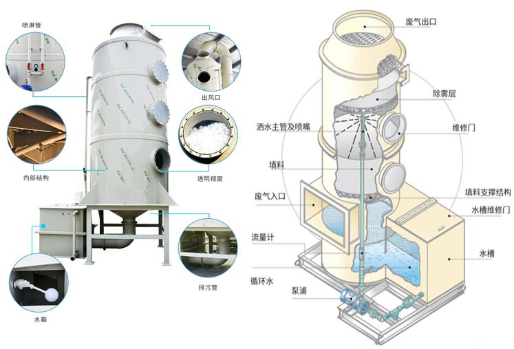 原理簡述:酸堿或含塵廢氣通過風(fēng)管引入凈化塔,噴淋循環(huán)液在塔底用水泵加壓后,通過防堵塞螺旋噴頭將吸收劑形成霧氣分子,然后通過填料層后再循環(huán)到塔底。酸堿廢氣和吸收液充分接觸,發(fā)生酸堿中和反應(yīng),去除廢氣中的酸堿成分等,同時(shí)液滴還會對粉塵進(jìn)行攔截,有效去除廢氣中的顆粒物。凈化的廢氣經(jīng)除霧器除去多余的水汽,然后進(jìn)入下個(gè)處理單元進(jìn)行深度處理,終由風(fēng)機(jī)排放到大氣中。